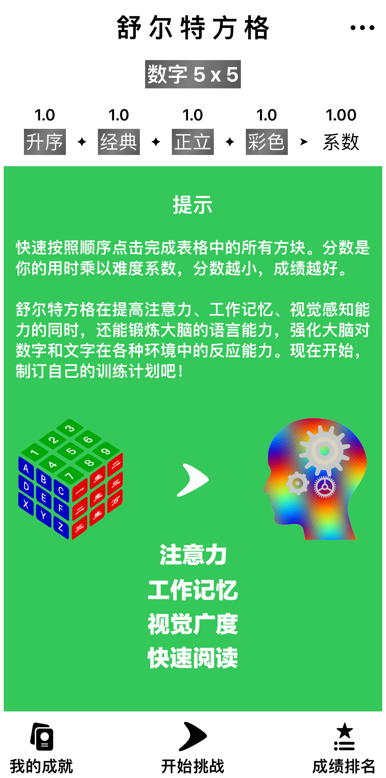 免费功能:数字4x4方格(基本设置:升序-经典-正立-彩色);数字5x5方格(基本设置:升序-经典-正立-彩色);数字6x6方格(基本设置:升序-经典-正立-彩色);成绩排名(当日/当周/所有时间);成就徽章(训练满100天);音效设置;每日打卡提醒设置