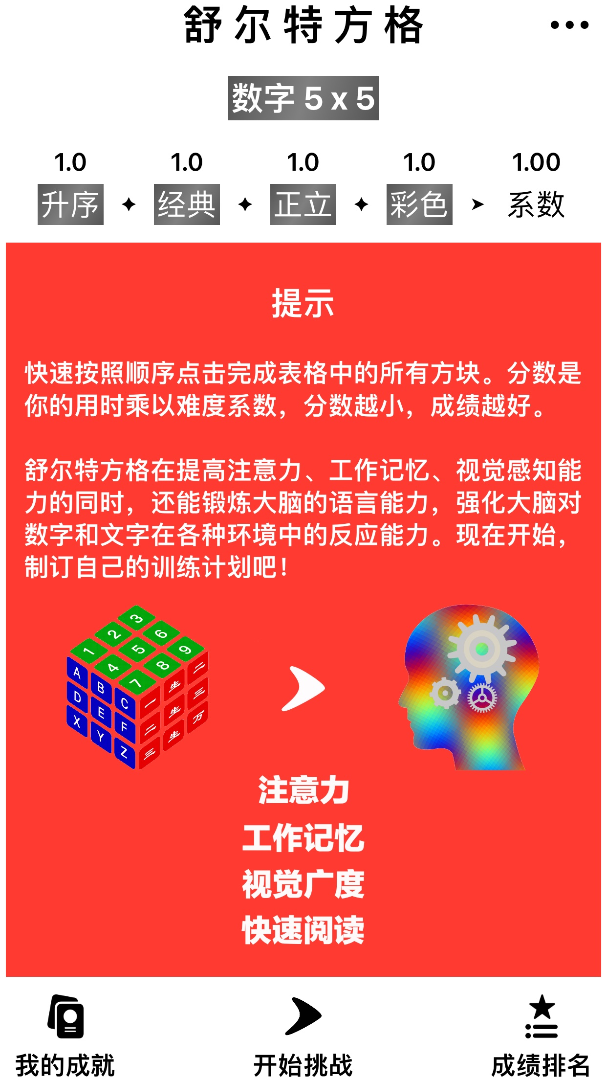舒尔特方格App超越传统的舒尔特方格应用。它支持数字表格、字母表格和汉语成语表格,每种表格都支持在颜色、形状和动态效果方面的设置。并且有五种训练模式,侧重训练大脑不同的功能,为您提供全面有效的大脑训练。特别针对注意力、工作记忆和复杂环境中的视觉识别反应做了专门的功能设计。注意力是指人的心理活动指向和集中于某种事物的能力,是人的认知能力的基础。工作记忆则是现代认知心理学提出的大脑对信息暂时存贮及其对复杂任务的联合运作,研究发现它在各种思维和学习活动中都起着至关重要的作用。